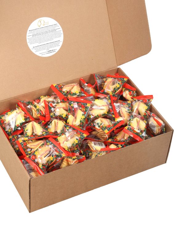 Печенье с предсказанием счастья, любви, богатства и процветания. Добрые, веселые предсказания на все случаи жизни. Надломите печенье, достаньте записку и узнайте, какое предсказание выпало вам. Насладитесь замечательным вкусом ароматного печенья и будьте счастливы! Вкусно, таинственно и оригинально. Состав: мука пшеничная в/с, соль, сахар-песок, растительное масло, вода, яичный порошок, ароматизатор ванили, идентичный натуральному.Товар сертифицирован и имеет все сертификаты качества. Печенье упаковано плотно в картонный гофро-короб и хорошо переносит транспортировку.В каждой коробке набор из 3-х печений в подарок. В коробке 100 штук.