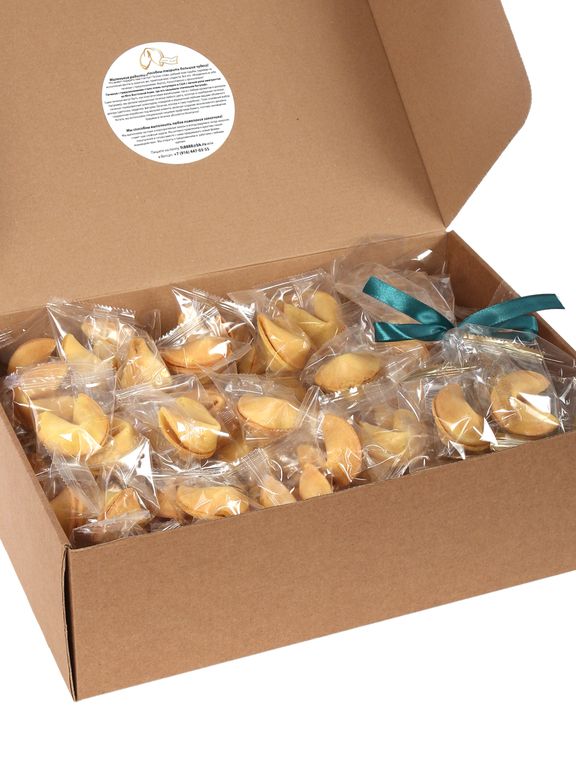 Печенье с предсказанием счастья, любви, богатства и процветания. Добрые, веселые предсказания на все случаи жизни.Надломите печенье, достаньте записку и узнайте, какое предсказание выпало вам. Насладитесь замечательным вкусом ароматного печенья и будьте счастливы! Вкусно, таинственно и оригинально. Состав: мука пшеничная в/с, соль, сахар-песок, растительное масло, вода, яичный порошок, ароматизатор ванили, идентичный натуральному.Товар сертифицирован и имеет все сертификаты качества. Печенье упаковано плотно в картонный гофро-короб и хорошо переносит транспортировку.В каждой коробке набор из 3-х печений в подарок. В коробке 100 штук , вес 1 кг.